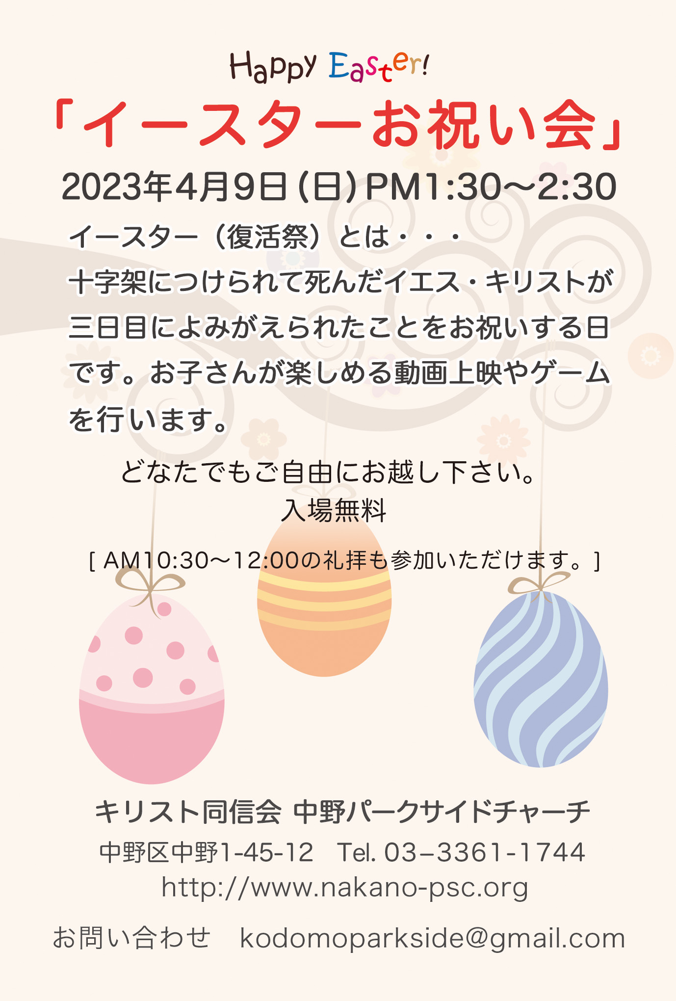 今年のイースター集会は、4月9日午後1時半から行われます。 今年は、お子さん達が楽しめる内容となっています。 老若男女を問わず、どなたでもご来場下さい。