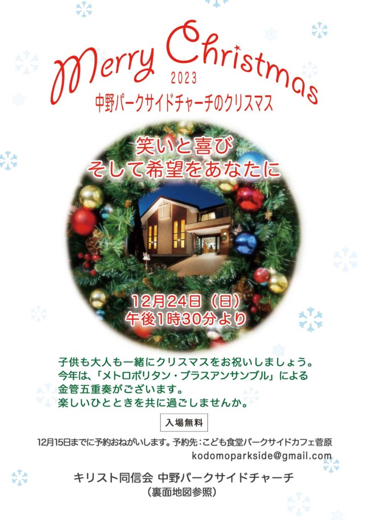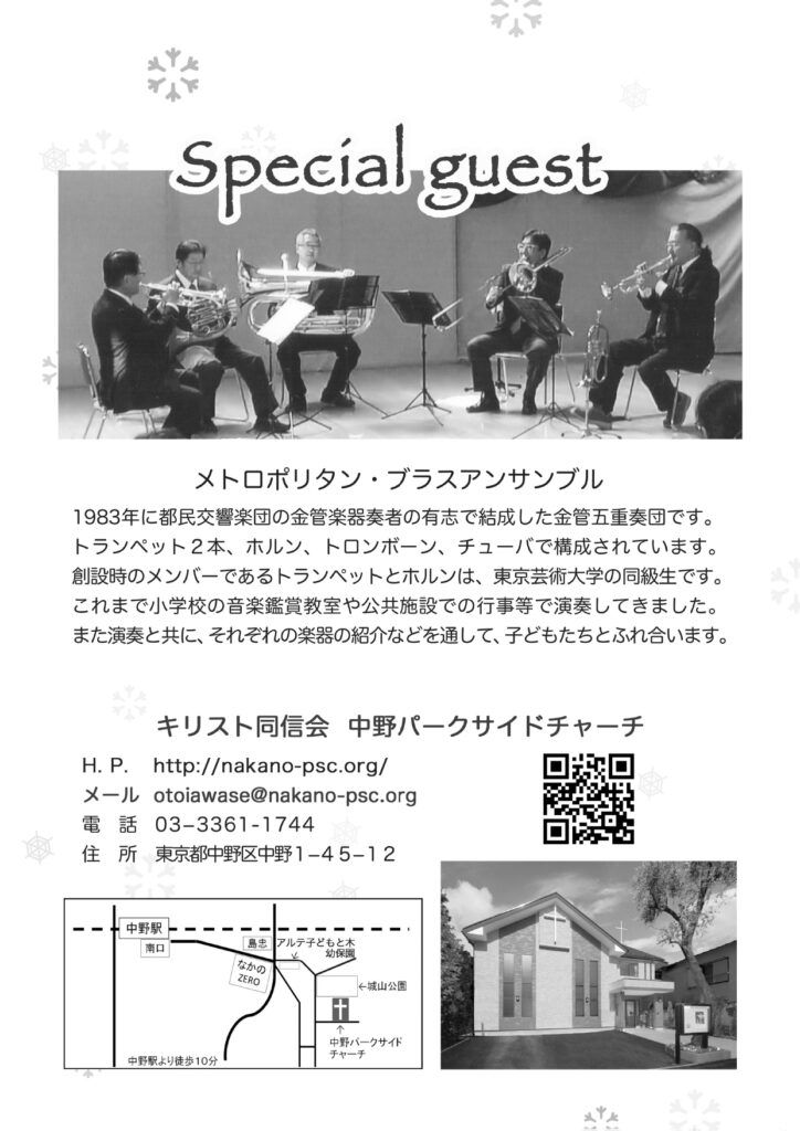 今年のクリスマス集会は、12月24日午後1時半から行われます。 今年は、「メトロポリタン・ブラスアンサンブル」による金管五重奏をお送りします。 老若男女を問わず、どなたでもご来場下さい。