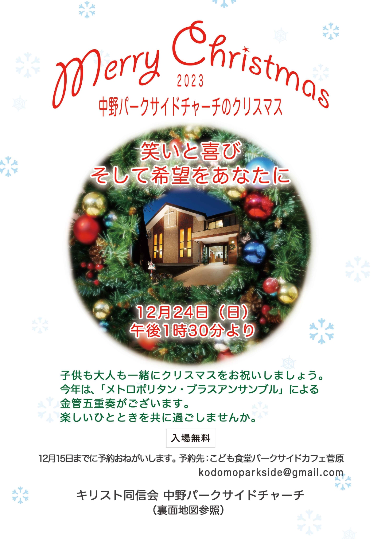 入場は無料で、強制的な献金などはありませんが、 ご予約を12月15日までにこちらのメールアドレスへお願いします。