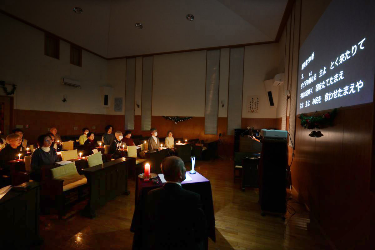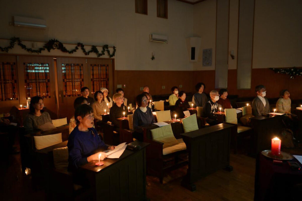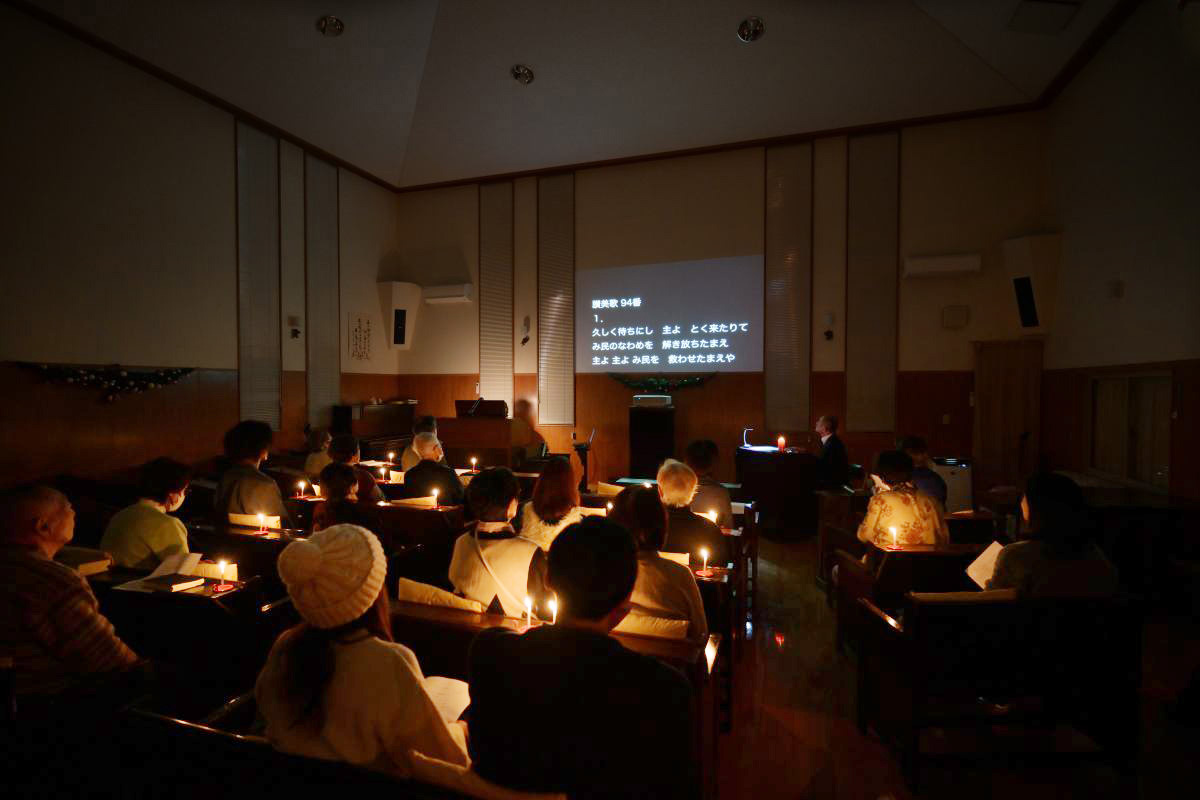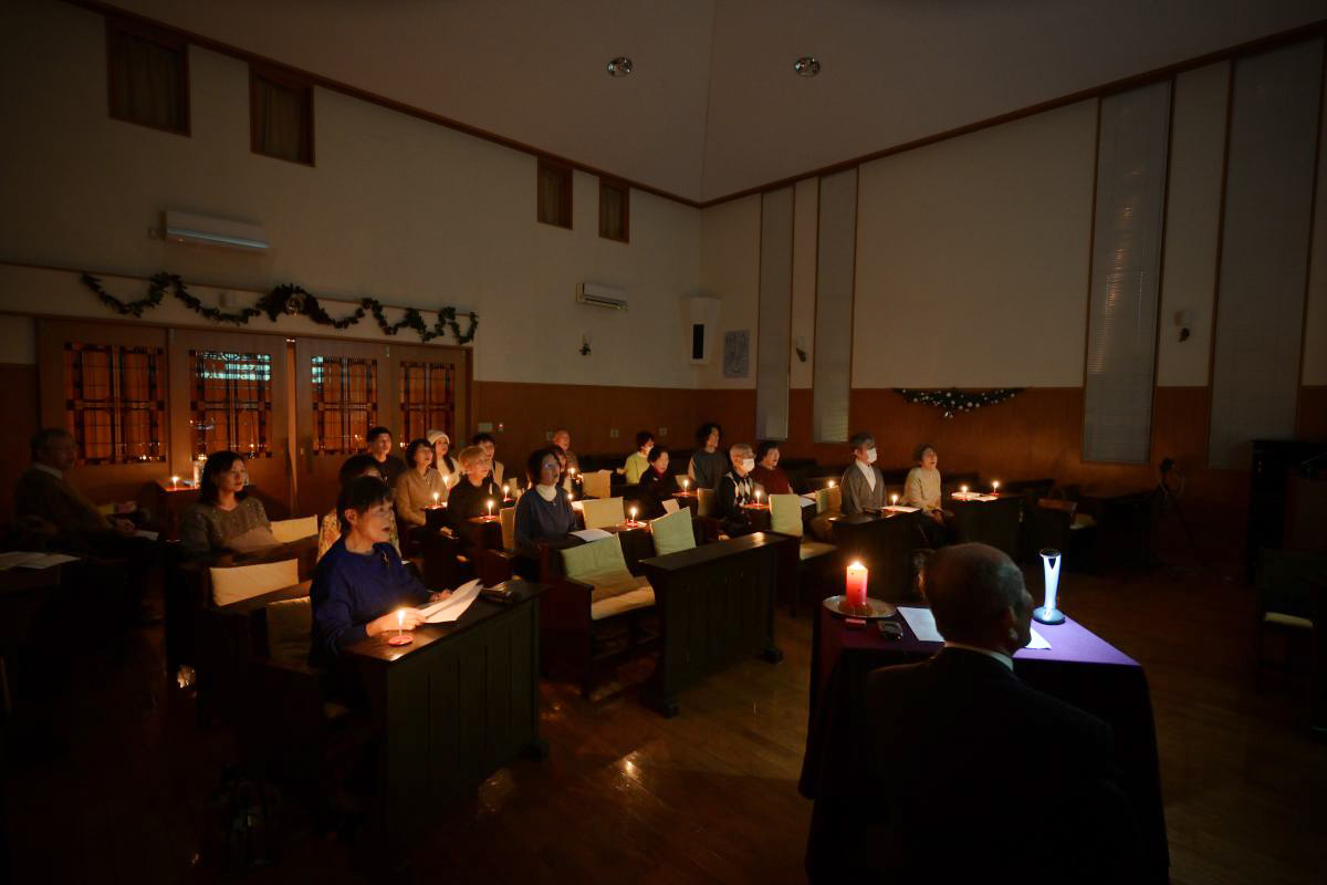 雨天の中、23人が集まり、キャンドルライト・サービスを行いました。浜田兄のお話に聖書朗読とクリスマスにちなんだ讃美歌の斉唱を挟み込むという、いつもとは違った礼拝でした。礼拝後は、姉妹方の心づくしの夕食をとりつつ、親睦を深めました。
